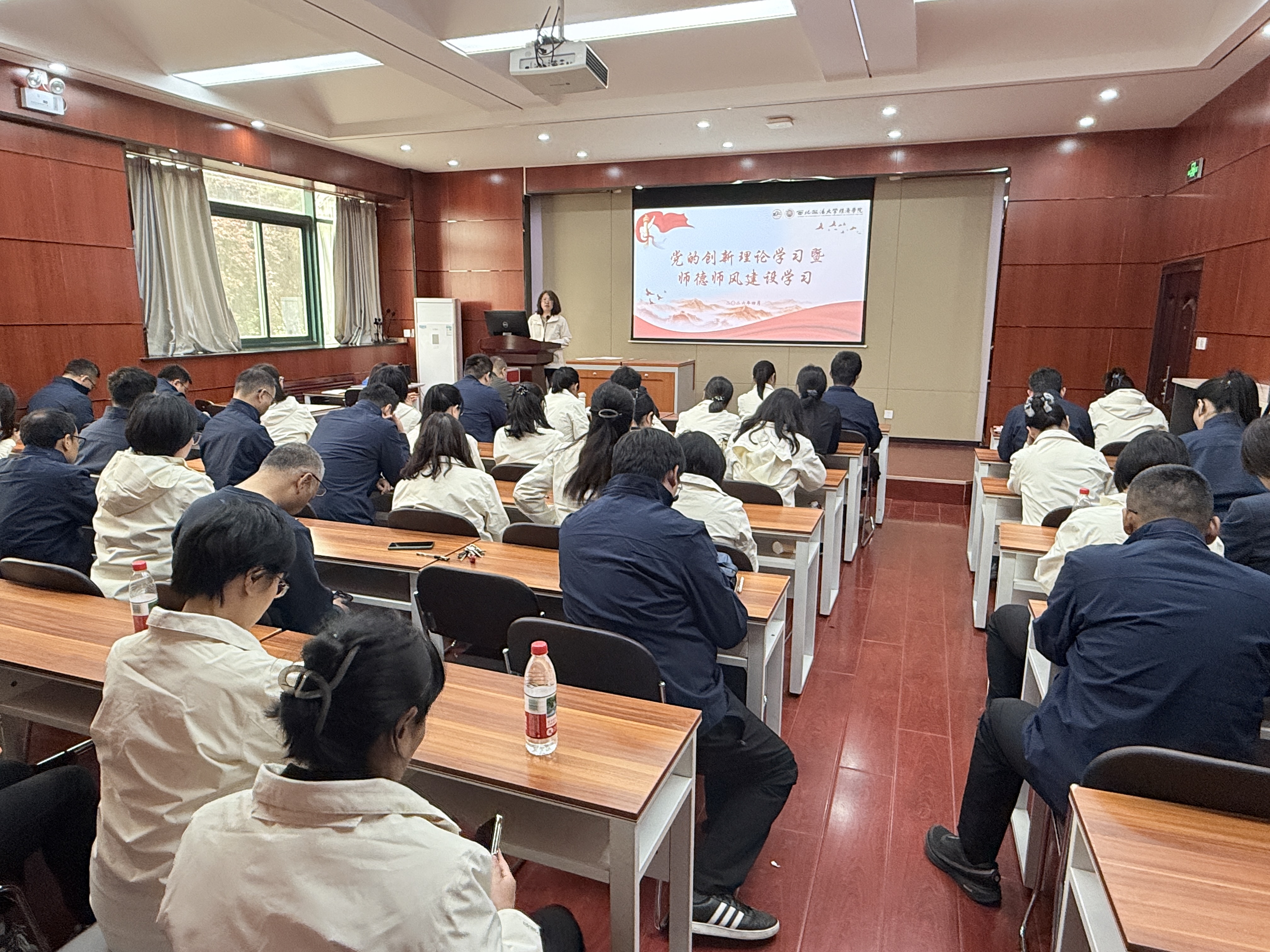 在长安校区天平楼B100教室召开党的创新理论学习暨师德师风建设学习会,学院党委书记李建梅主持会议,全体教职工参加会议。