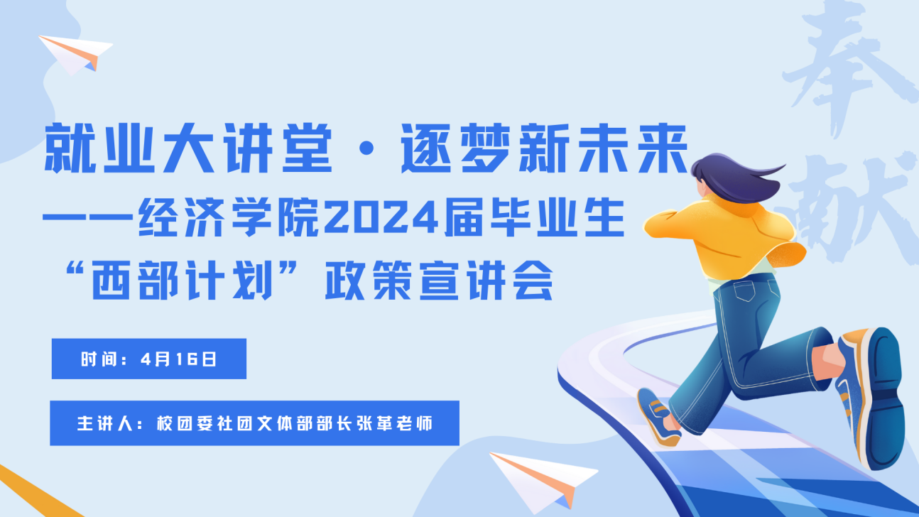 为响应国家“西部计划”号召,大力支持西部地区发展,鼓励和动员更多优秀毕业生积极投身乡村振兴,努力服务地方基层,到祖国和人民最需要的地方建功立业。4月16日晚,pg电子app 以线上线下相结合的形式,于天平楼B100教室开展2024届毕业生“西部计划”政策宣讲会。此次会议邀请校团委社团文体部部长张革老师担任主讲人,2024届毕业年级辅导员李念老师主持,2024届毕业生积极参加。